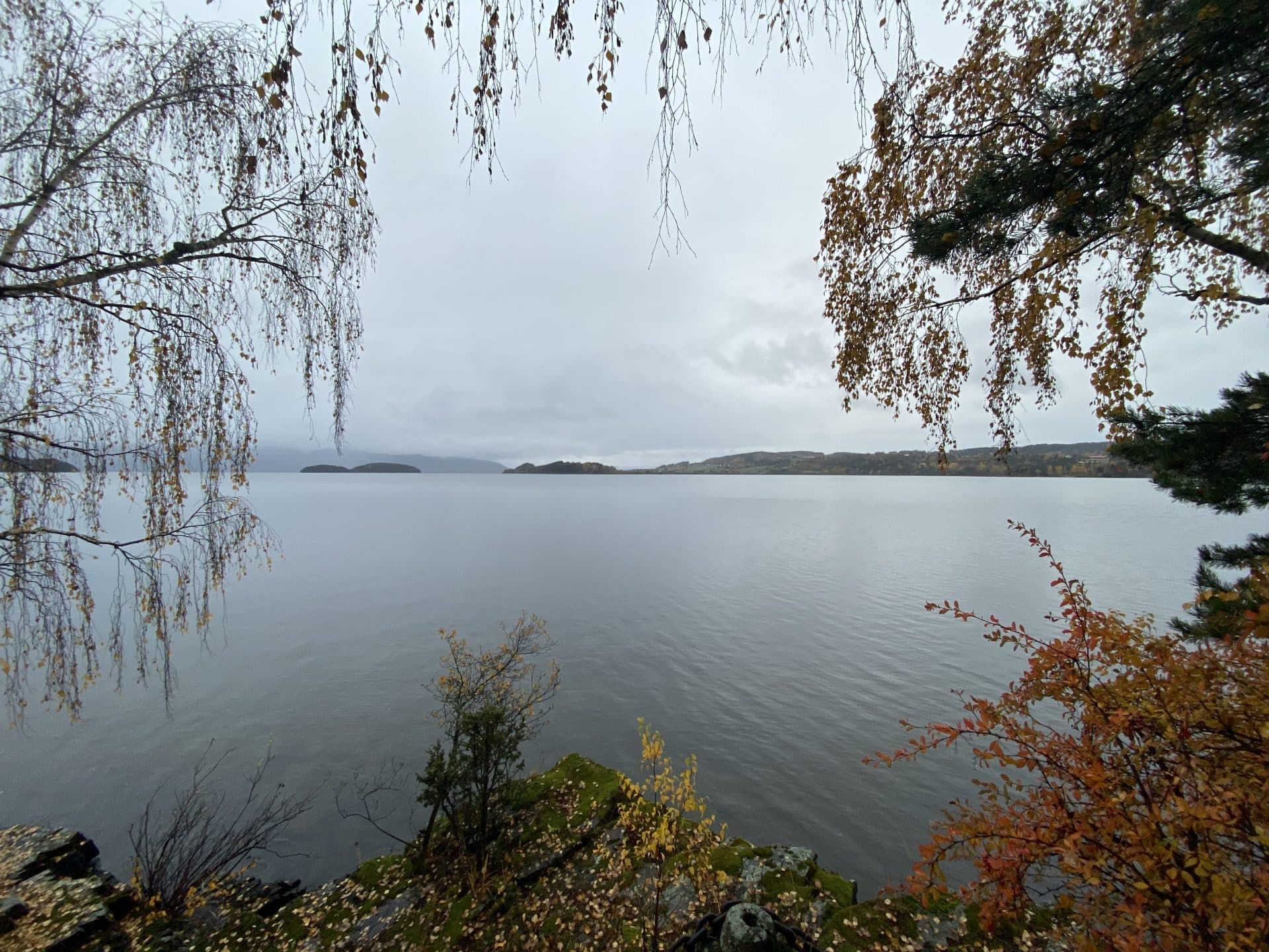 Det er full høst, regn og lave skyer. Vi ser Røysehalvøya til venstre, Bønsnes rett frem, og Frognøya. Litt til venstre Svartøyene og i skyene bak ligger Finnemarka.