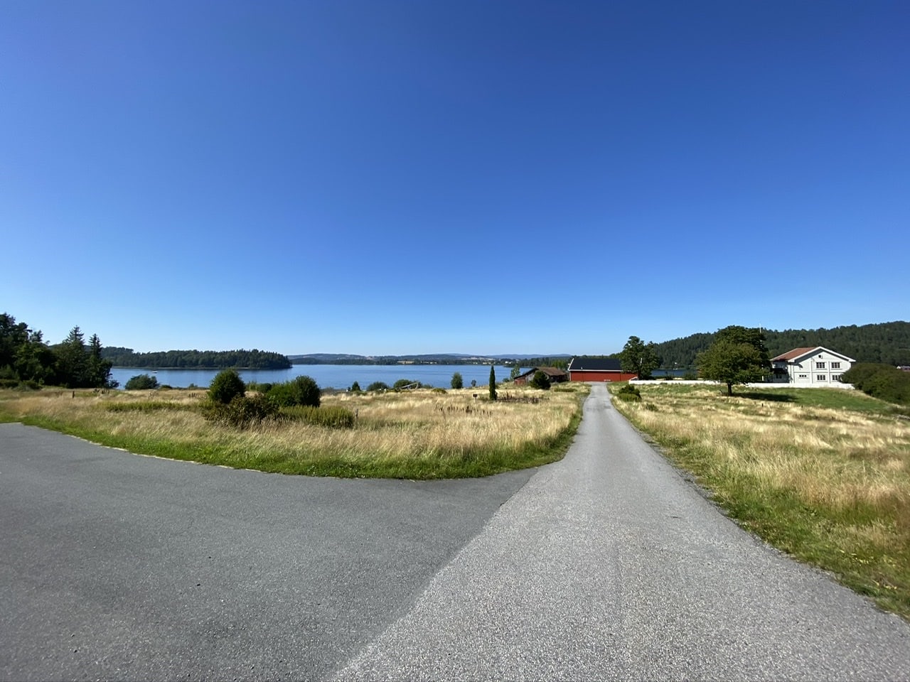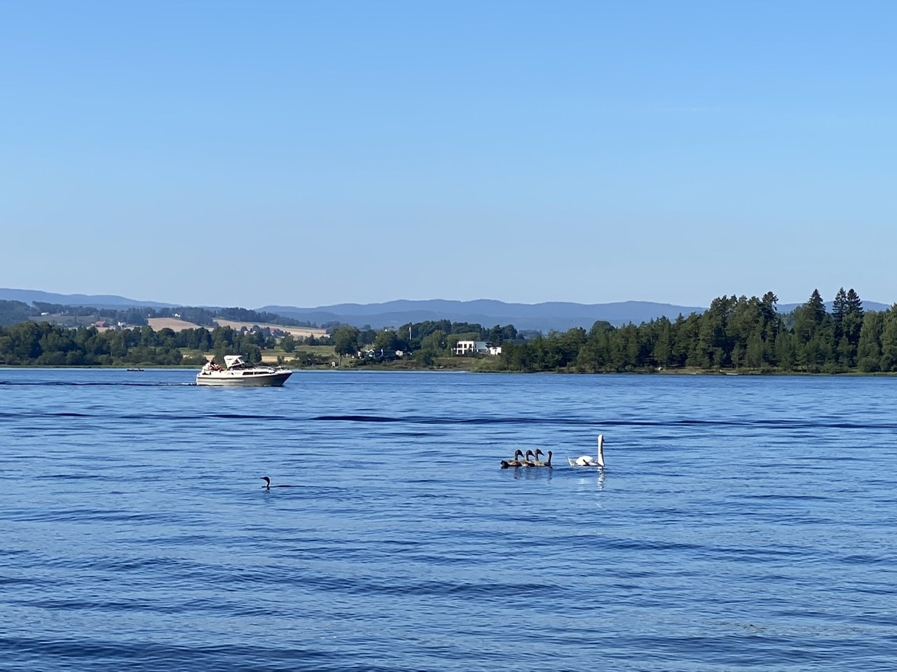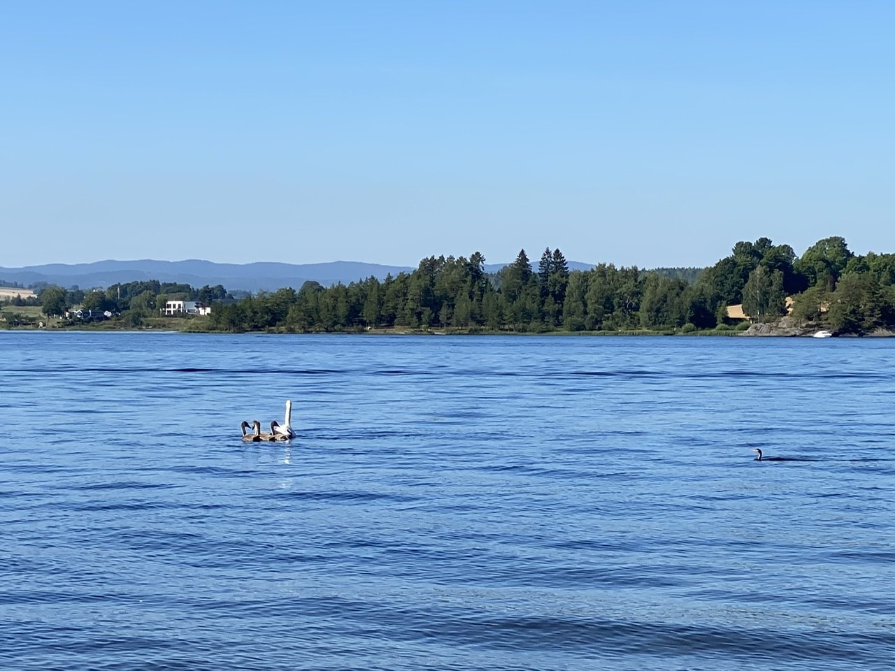 Svanemor er ute med 4 unger, sjeldent syn at de har 4 unger så seint på sesongen. Svanefar er borte. Den lille klossen er til ei krepeteine. Vi ser over mot Fekjær og Rytteraker. Flott varm dag og 25~26 grader.