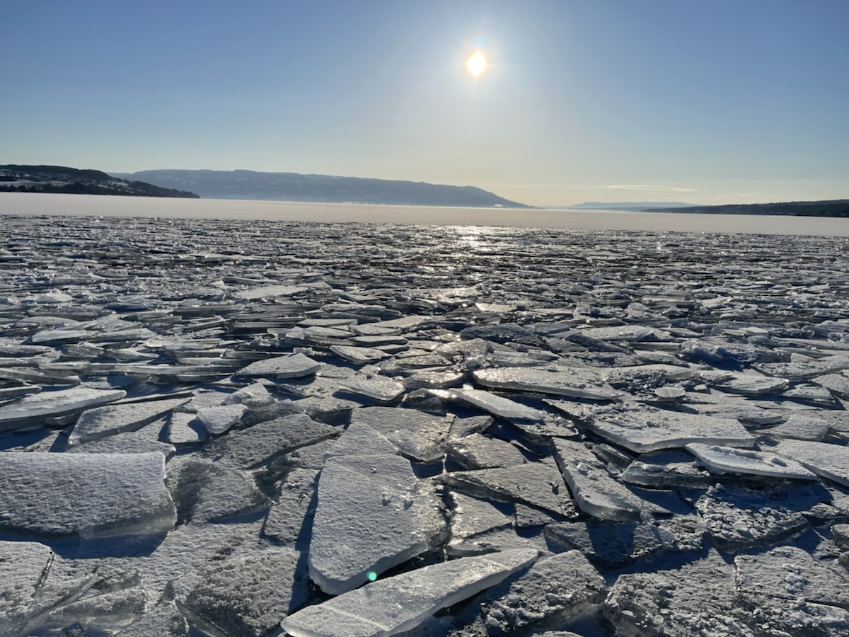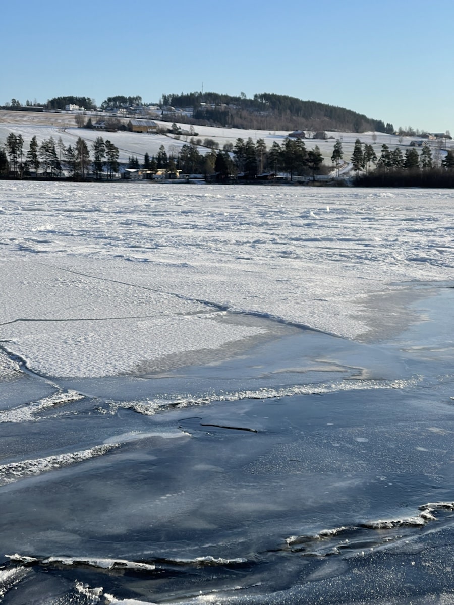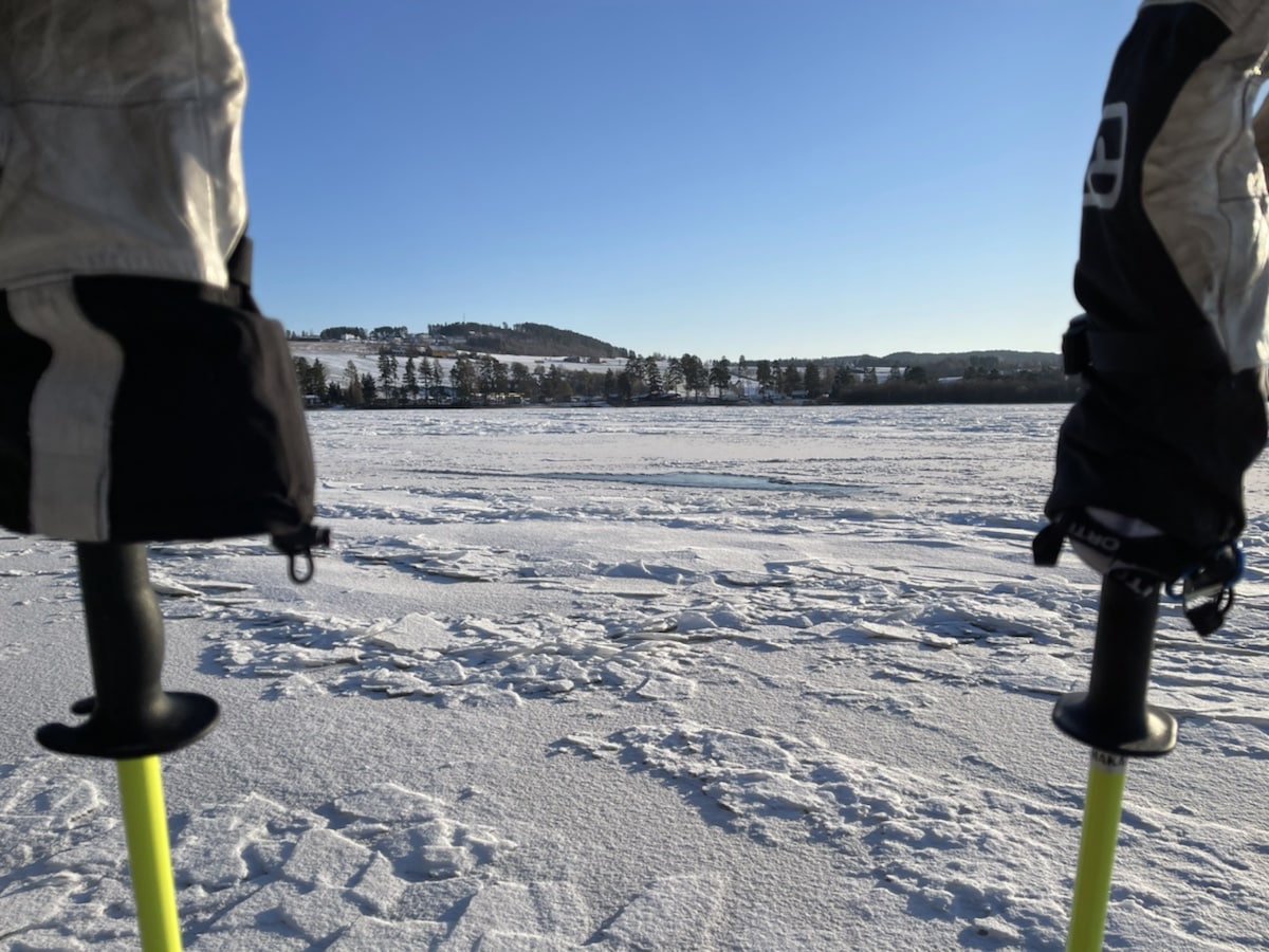 Storelva har fått is over til Busund fra Saga på Helelandsmoen