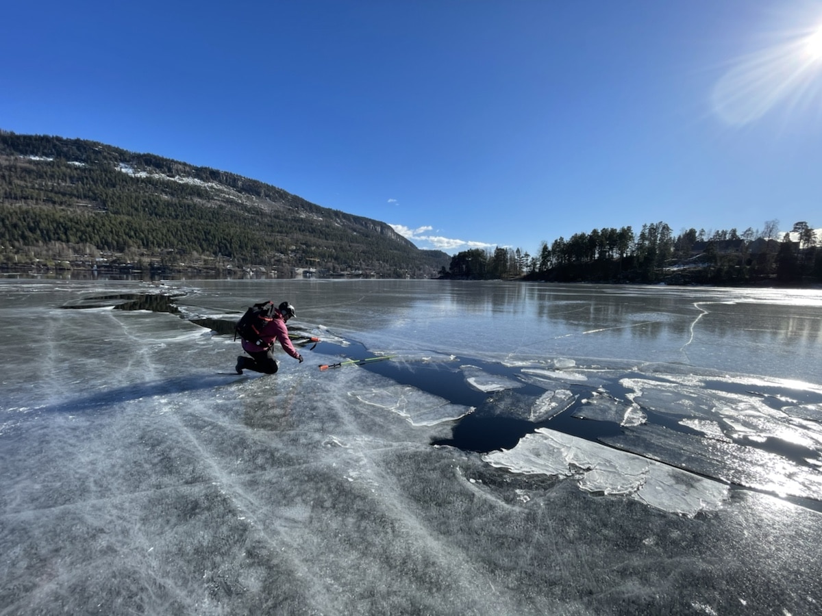Denne råka, som var ca 60 cm brei på det smaleste, gjorde det risikabelt å krysse over. Isen begynner å bli preget av våren, og været. Så Morten kontrollerte isen mot den åpne råka. Men han har betydelig iskunnskap og riktig utstyr. Vi ser utøya til Høyre og utstanda i bakgrunn. Krana midt i bildet er til den nye veien ned til kaia på landsida c for ferja til Utøya.