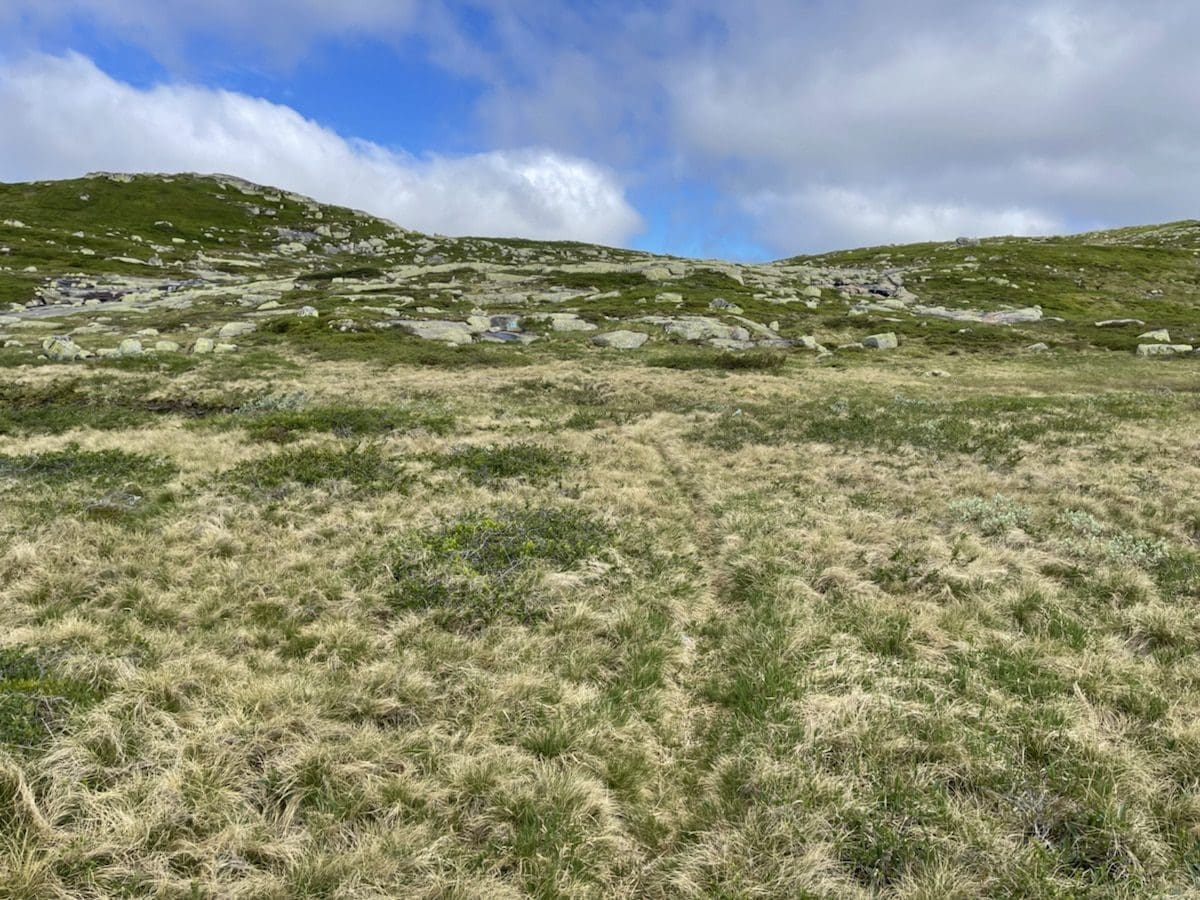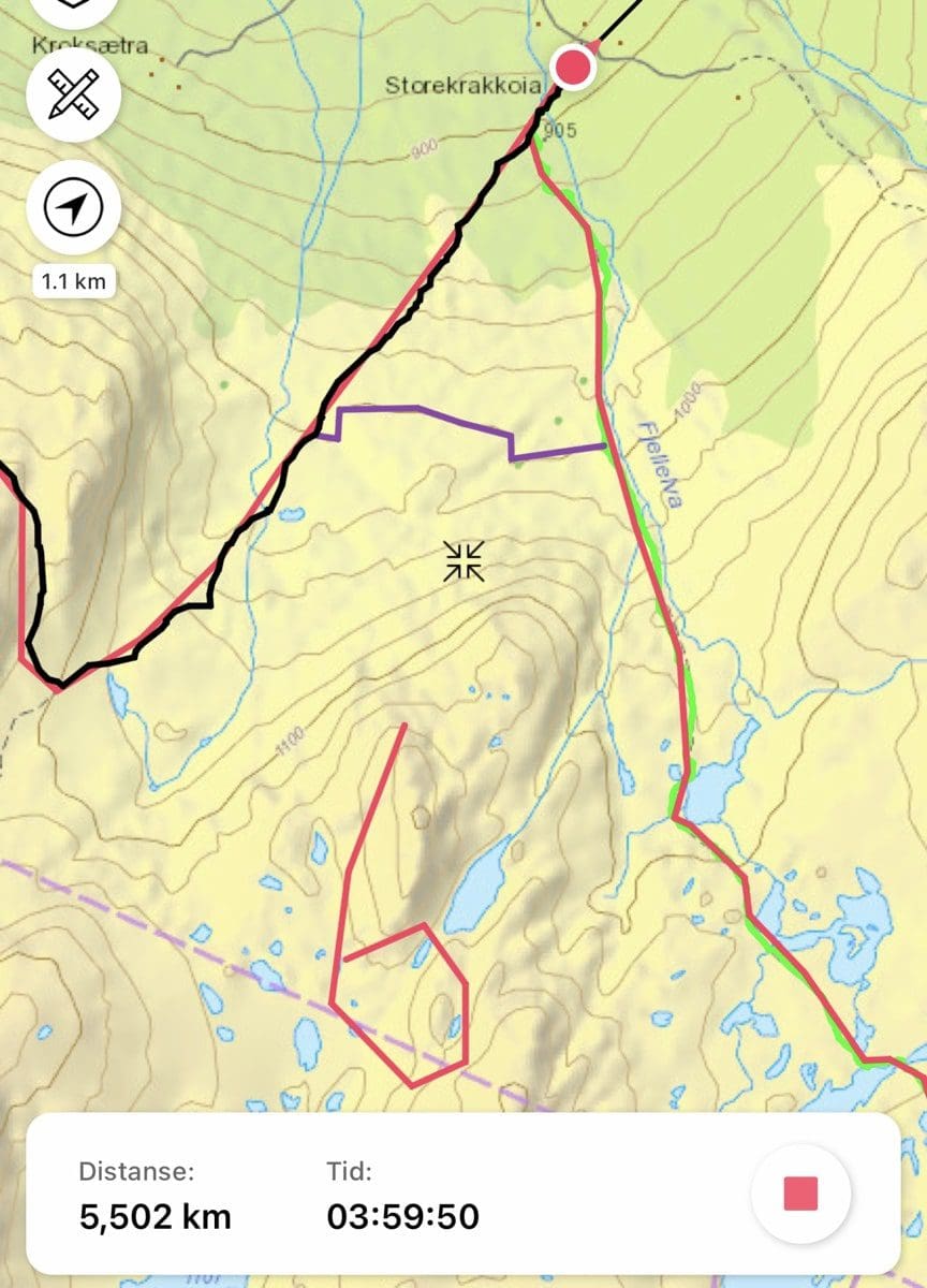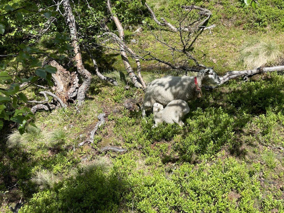 Her var det sauer, og stien syns. Vurderte å krysse over på ca 1000 moh, det hadde vært ca 600 i greit terreng.