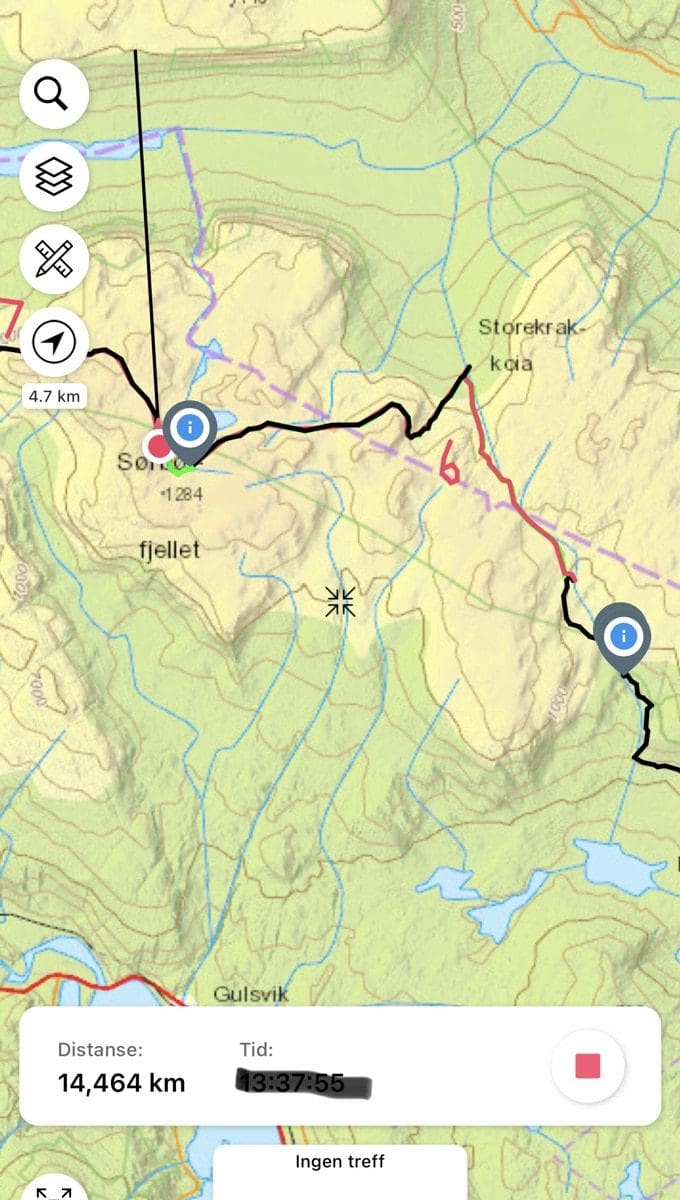 Ble 14.4 km på gps. 16 km på skrittelleren og 25401 skritt, 854 høydemeter på Topokart og 84 etasjer. Glemte å skru av gpstrackinga, men starte å gå ca kl 9 og gikk til kl 19. Så ble en lang dag, og kjenner at beina er glade for å hvile. Sår under fotblada, men kroppen forøvrig er ok.