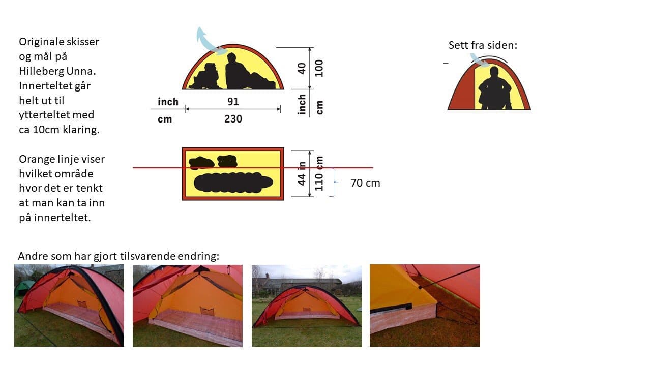Det er også noen som har bygget om innerteltet for å få et lite fortelt. Men gir noen utfordringer, da døra blir for stor. Tegning hentet fra nettet, husker ikke fra hvor dessverre….