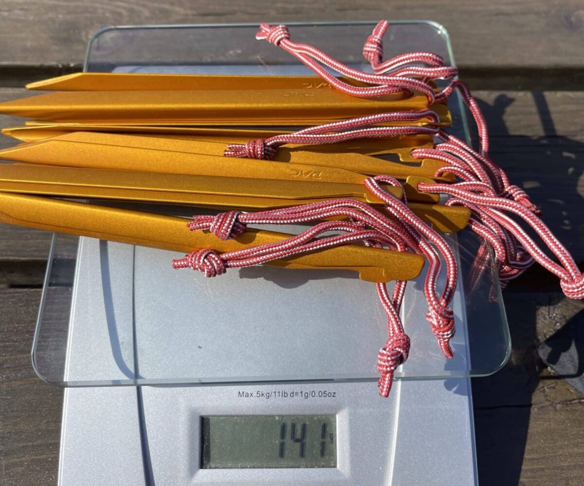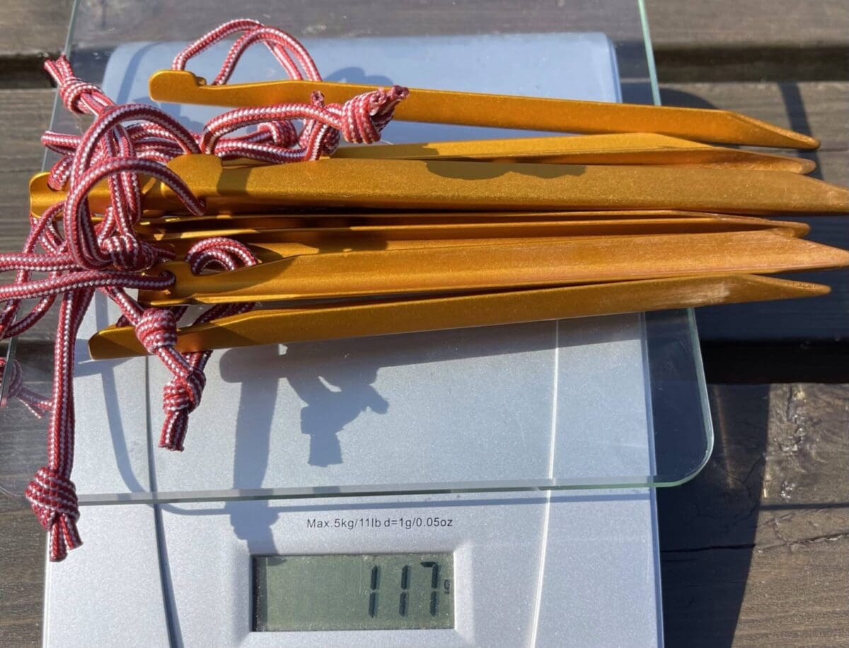 Vekt 10 plugger, dvs 12 gram pr plugg. Noen av disse kan byttes ut med feks msr Carbon core plugger på 5.5 gram. Men ikke mye å spare i vekt her.