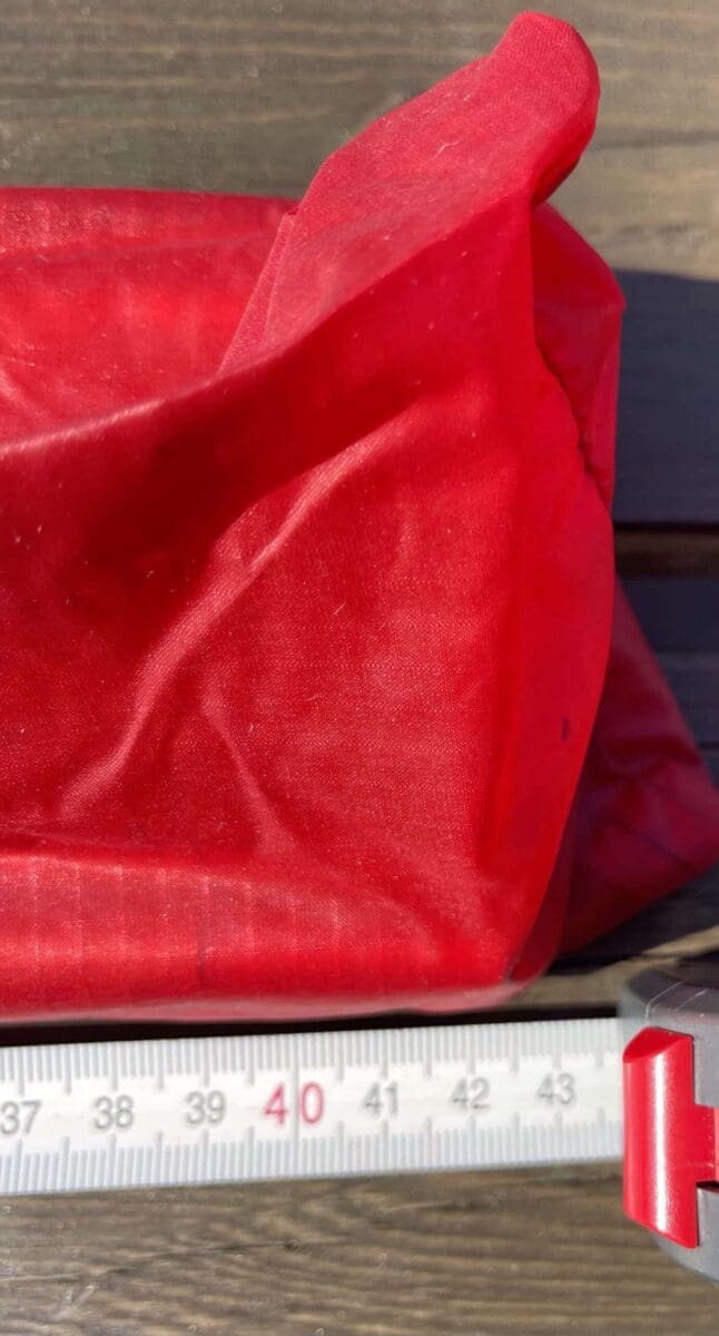 Når du flytter inn en skrå vegg -her døra, vil døra bli for lang. Så enten må døra lages med mindre «høyde» -egentlig kortere lengdemål fra toppen og ned mot bunnduken, ellers så må bunnduken ikke gå så høyt opp på dørsida. Hvis ikke blir det slapt, og det har jeg ikke løst enda. Mulig jeg ender opp med å sprette opp forteltet, og neste det sammen med tape/ merke hvordan jeg har tenkt det. Ellers blir døra slapp.