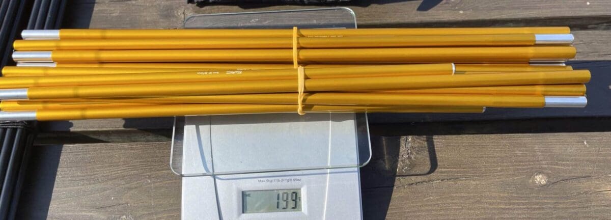 Minimum vekt, dvs inner og yttertelt og stenger er oppgitt til 2.0 kg. Her er vekt med telt inner og utter, samt teltpose.