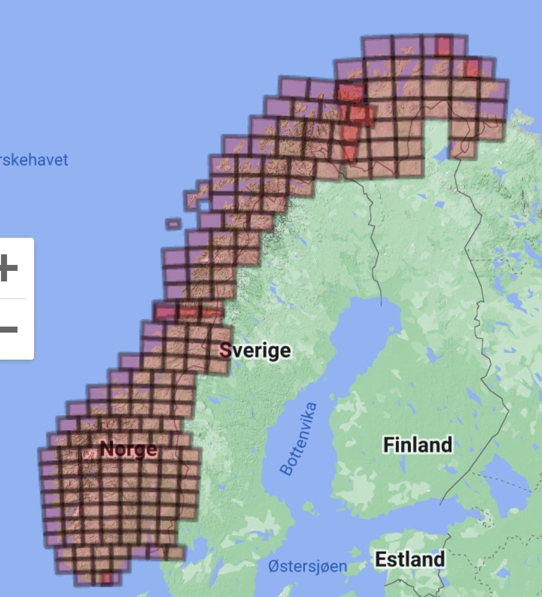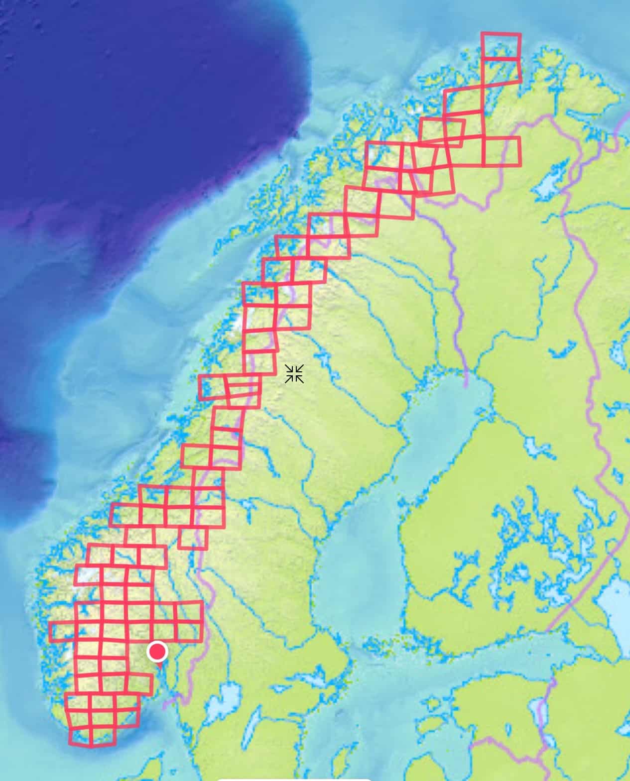 Siste og første kartet om du har planer om Norge på langs. Disse karta henger stort sett sammen, men har 3 hoveddeler pga Norge er litt vridd.