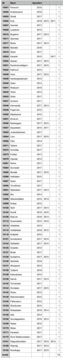 Har 78 stk, trodde jeg hadde 79. Men det siste er solgt. Greit med regneark om jeg kommer over noe på finn!