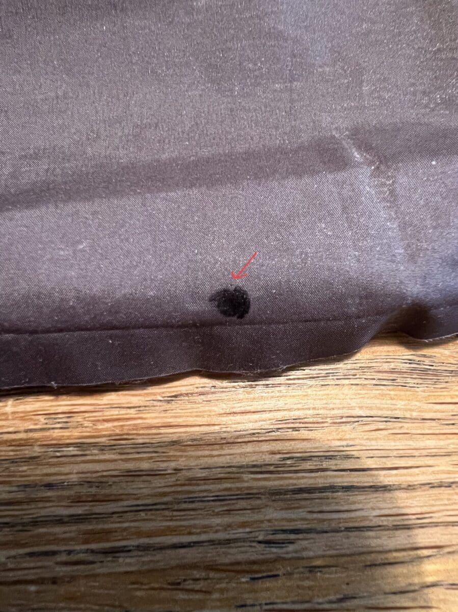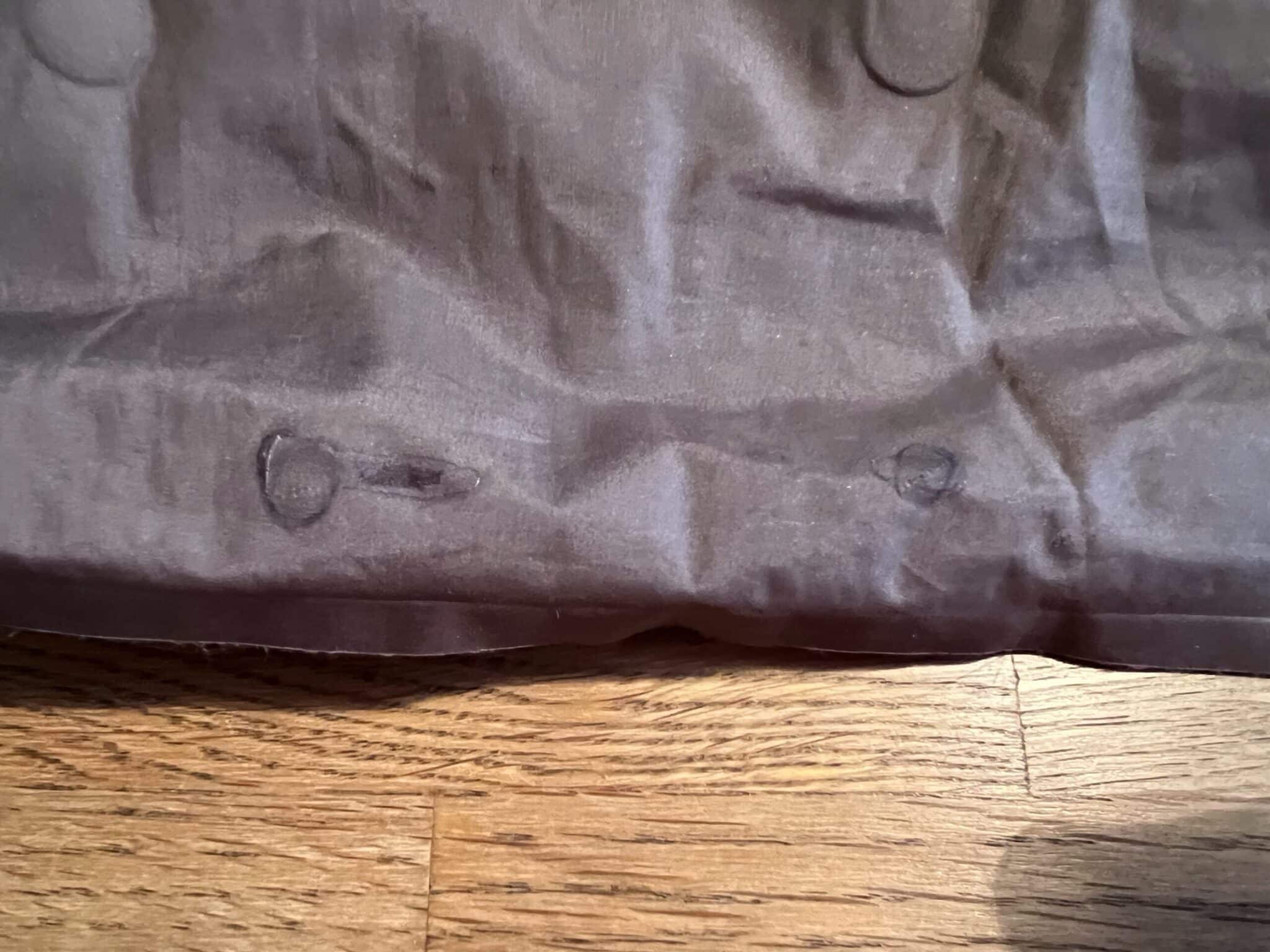 Du ser at de har brukt feil lim, eller ikke rengjort med rødsprit. Bare litt av limet er i kontakt med stoffet…. klumpete også. Limet var også for hardt etter min smak.
