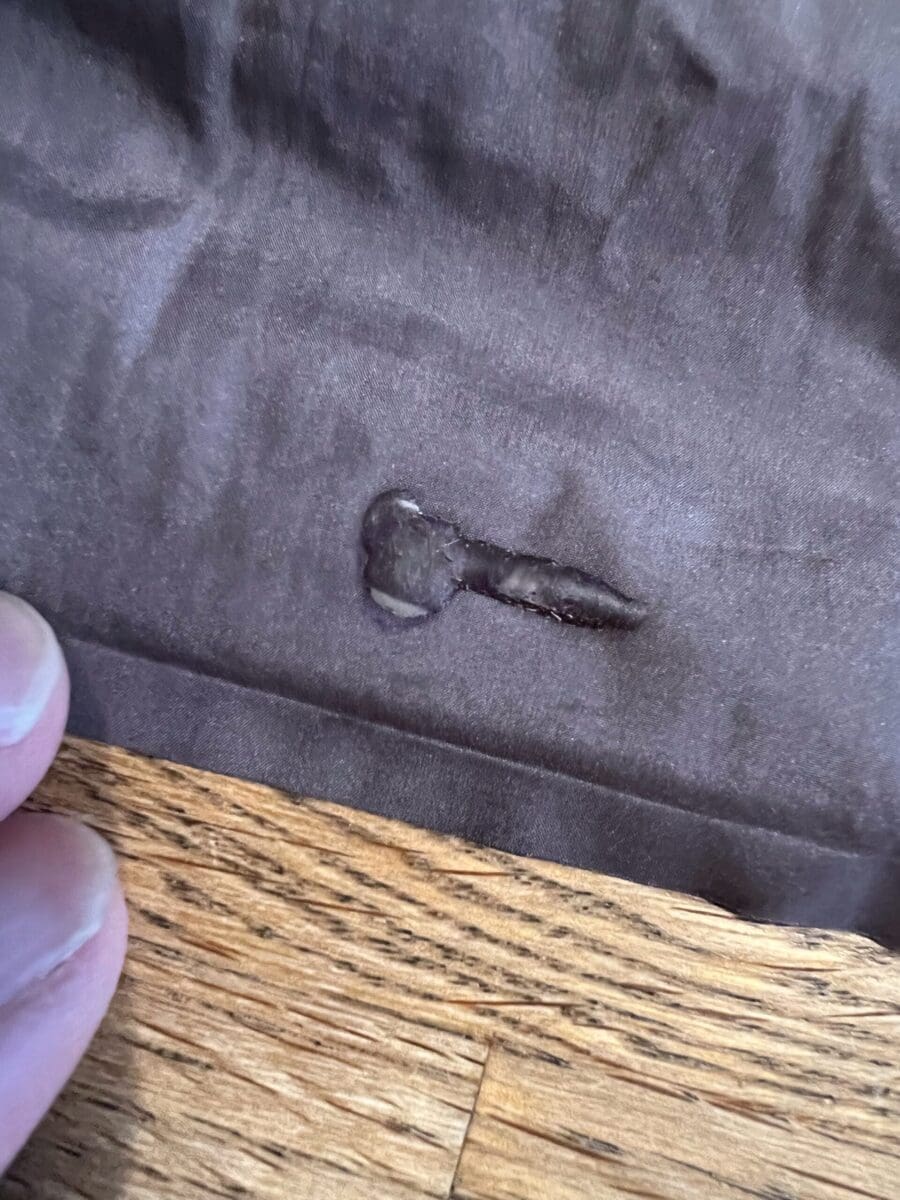 Så de ble fjernet, rengjorde da 5 hull, og la på nytt lim. Brukte Aquasure. Det er seigt. Det beste er 2 tynne lag, hvor det første er nesten bare å dytte limet ned i stoffet/hullet. Og så et tynt lag til. Trenger ikke mye.