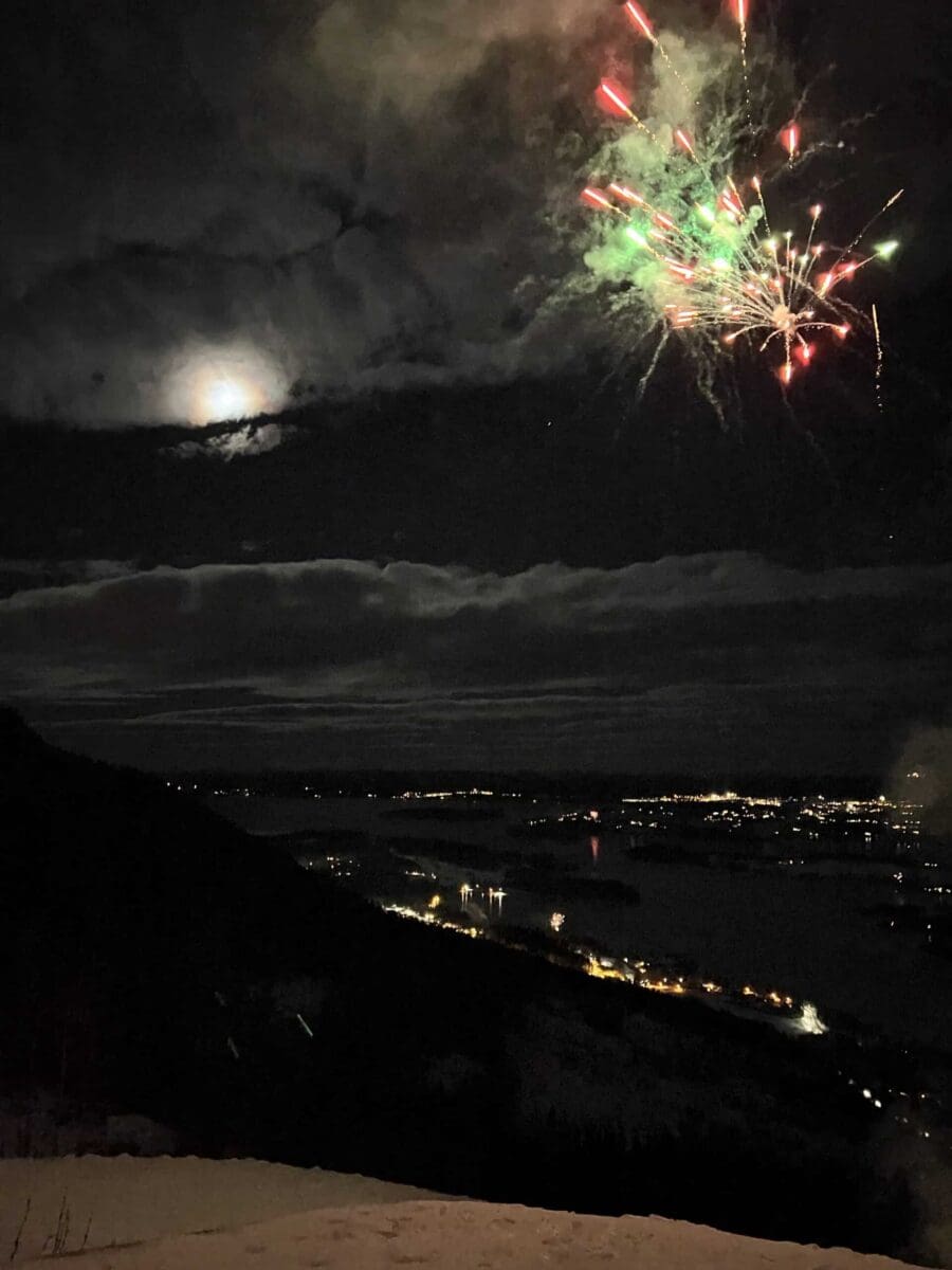 Da passet det å reise opp for å se på fyrverkeri. Det var ikke kaldt og ikke vind, og klarvær. Det var fullt av biler over alt! Tipper 25-35 stk.