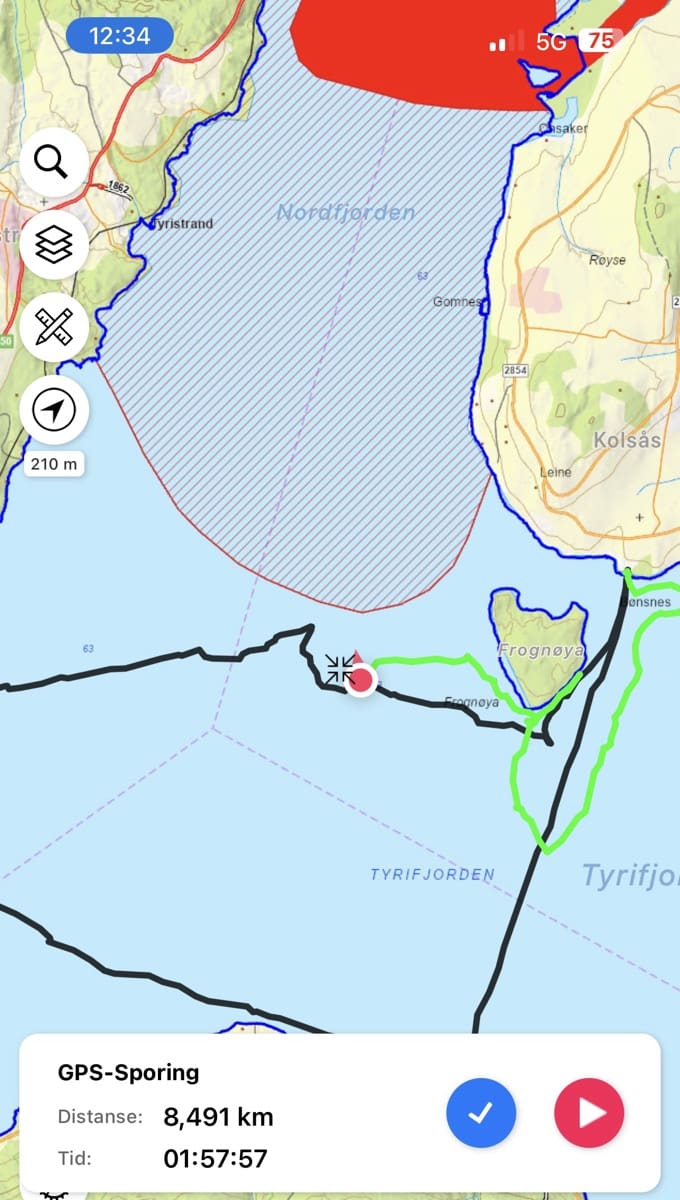 I stedet krysset vi over til Furetangen for en ny lunsjpause i sola. Deretter fulgte vi land i retning Gulsrudtangen og vurderte ulike alternativer for retur. På grunn av gårsdagens store og uoversiktlige råker tok vi en tryggere rute vestover mot Nordfjorden. Her skilte vi lag med Morten S, før vi fortsatte videre oppover. Området rundt Nordfjorden var mer krevende, med tynnere is enkelte steder og uforutsigbare forhold.