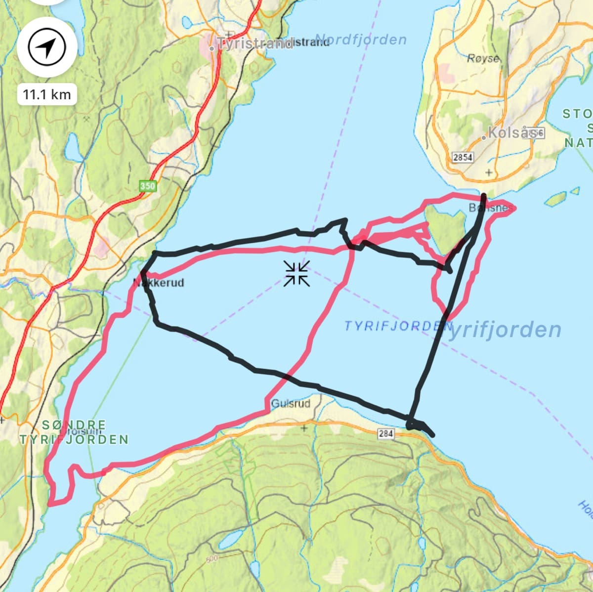 Da han ankom, krysset vi Storfjorden mot Nakkerud. Isforholdene var flotte, men vi møtte flere råker som var utfordrende å passere. Videre gikk vi over store, jevne flater med stålis i retning Vikersund – en fantastisk opplevelse i solskinnet! Vi fortsatte forbi Drolsumtangen mot Tveiten, men her stoppet vi ved en én meter bred råk. Dessuten lå det gammelsnø på isen, og vi så en gruppe svaner i det fjerne, så vi vurderte det som ufremkommelig videre mot Vikersund.
