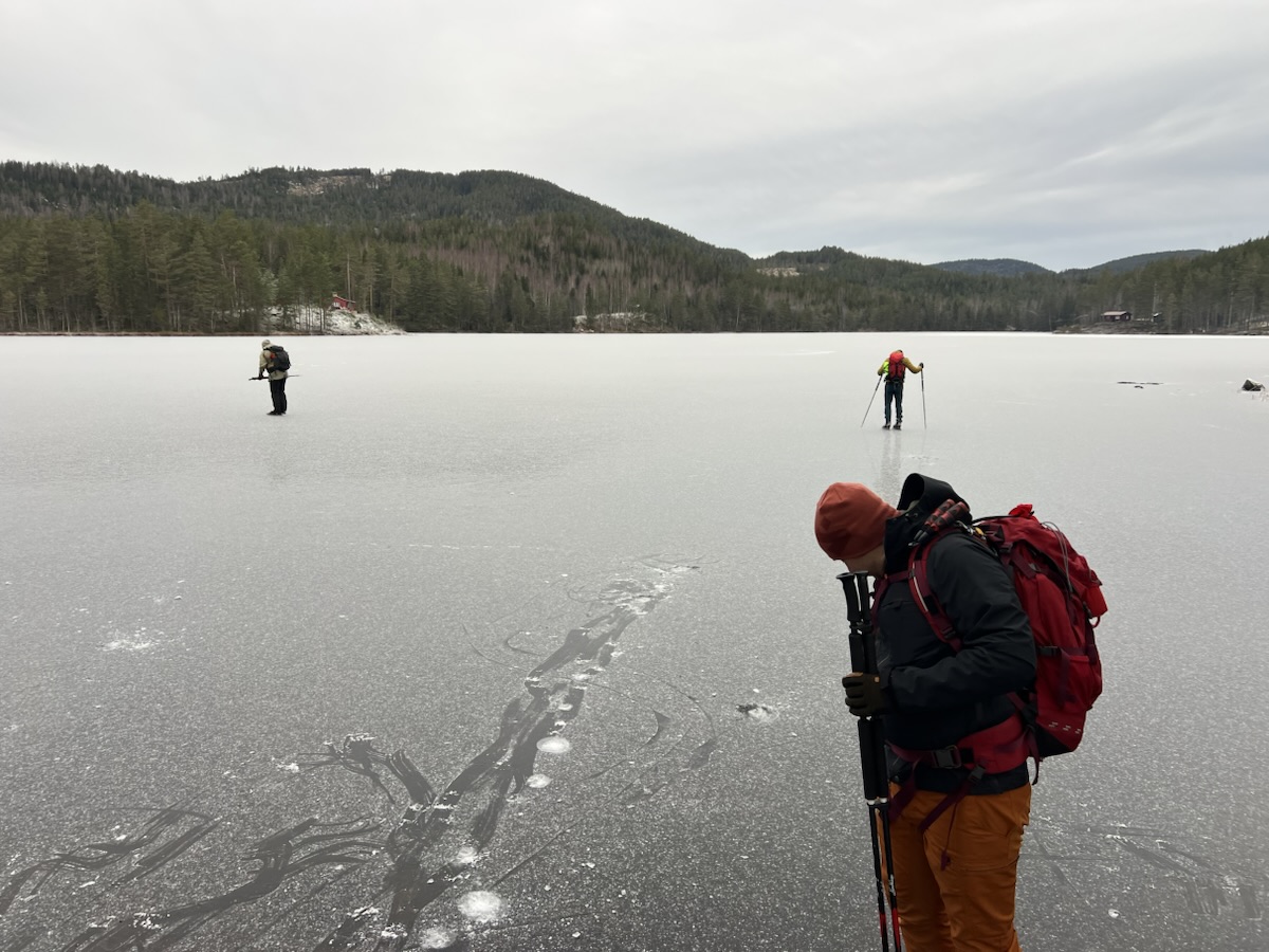 Mer enn tykk nok is, ringte etter å ha leita etter dekning. De var i snøen i Nordmarka.