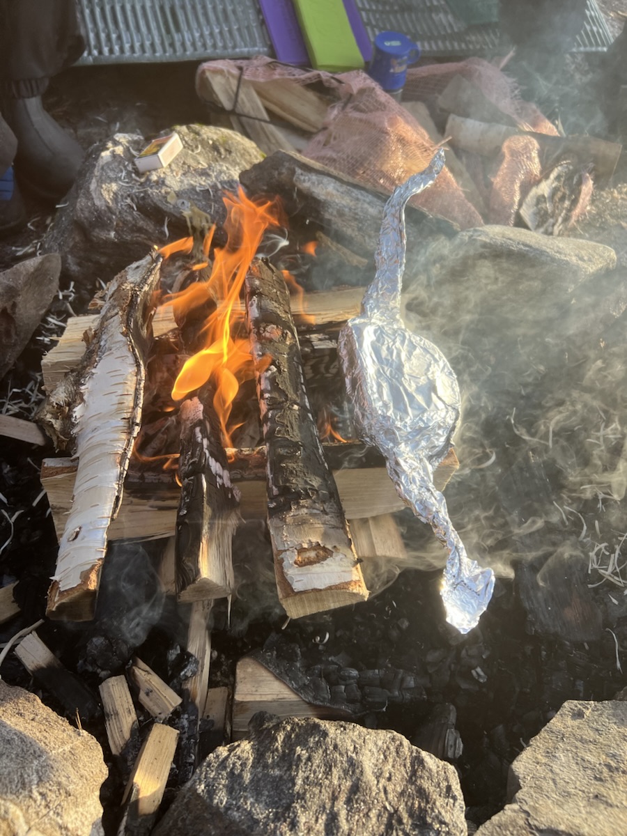 Siden vi ikke hadde noe bål under lunsjen fra spare tid, og når vi kommer i land, var det to pappa som hadde bål. Så jeg fikk låne litt varme til å lage meg ostesmørbrød. Veldig hyggelig karer som er ute med barna sine, og mammaen kom også etterhvert. Det var mange barn. Veldig hyggelig å treffe folk på Holleia.